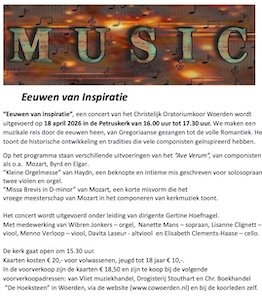 Dit concert van het Christelijk Oratoriumkoor Woerden wordt uitgevoerd op 18 april 2026 in de Petruskerk van 16.00 uur tot 17.30 uur.
